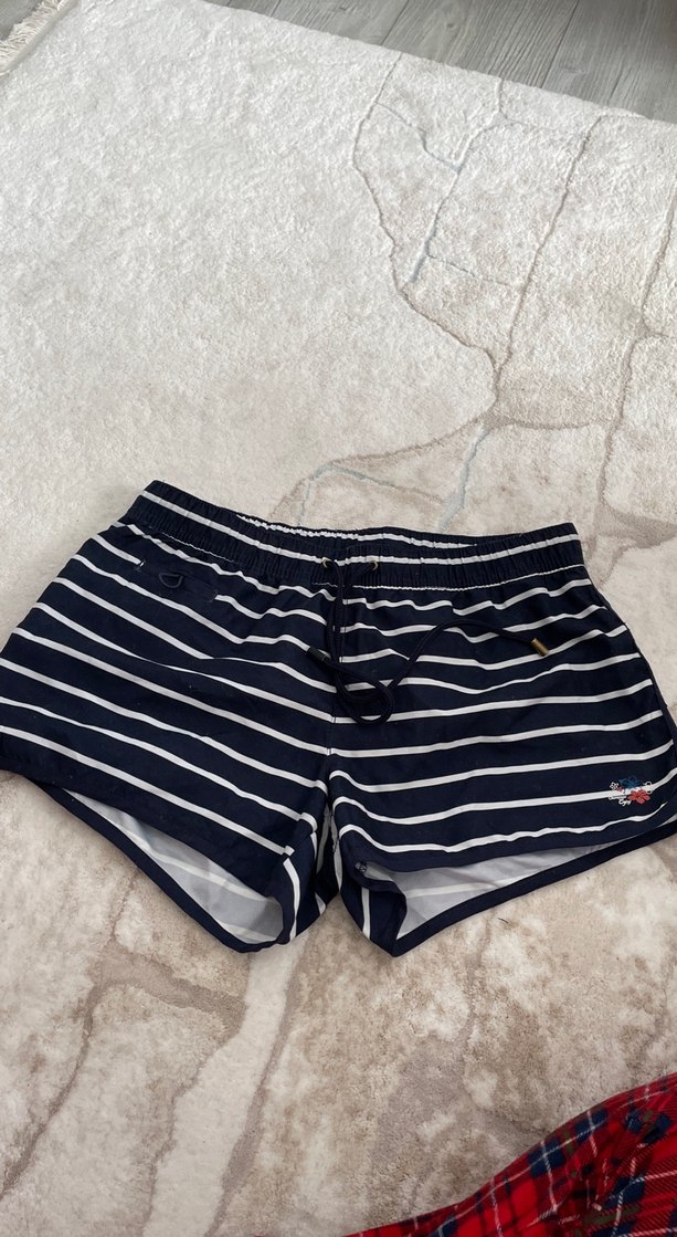 Düğmeli detaylı, beyaz çizgili koyu mavi mini şort. Yumuşak kumaştan, plaj ve sokak stiline uygun.