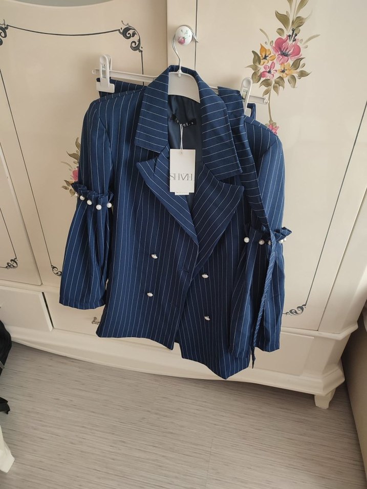 Düğmeli, çizgili lacivert pantolonlu takım 34 beden hem şık hem spor 1,66 boy 44 kiloda giyildi kızım dayısının nikahında bir kere giydi