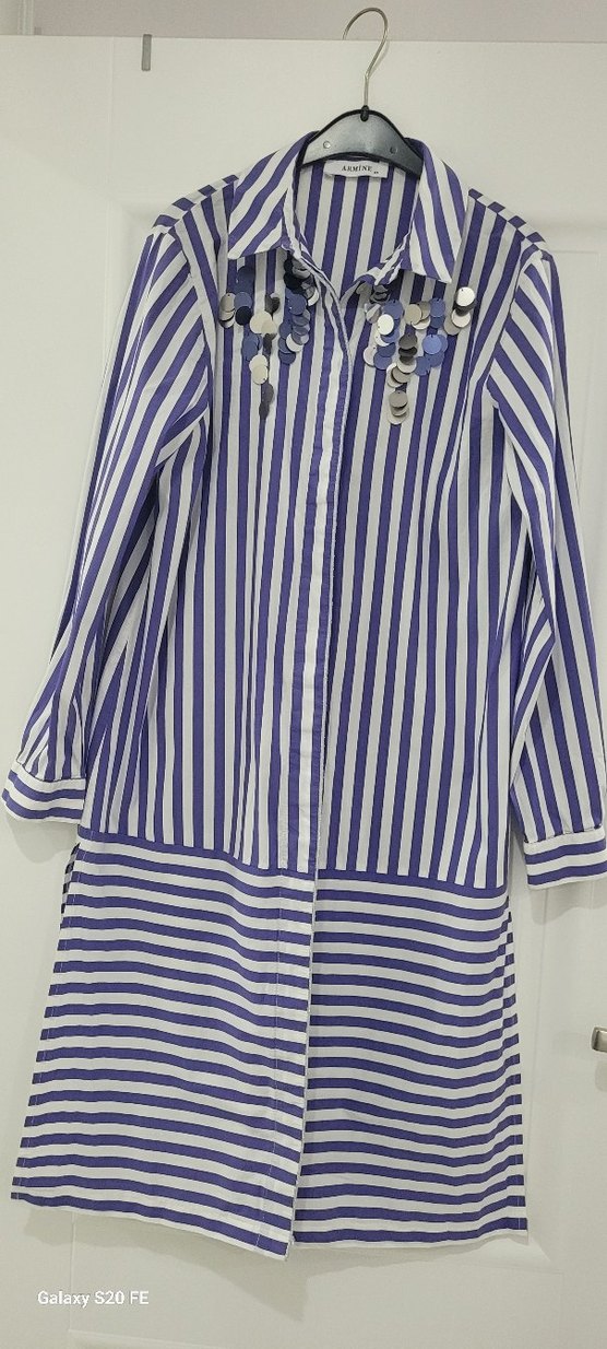 Düğmeli, uzun kollu, lacivert çizgili ve normal kesim kadın gömlek.tunik Yaka kısmında dekoratif detaylar bulunur. Günlük kullanıma uygundur. iki koltuk arası 50 cm boyu 102 cm