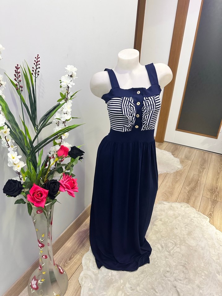 Lacivert uzun penye elbise, askılı ve düğmeli üst kısmıyla dikkat çeker. Regular kesim ve çizgili desenle günlük kullanıma uygundur.