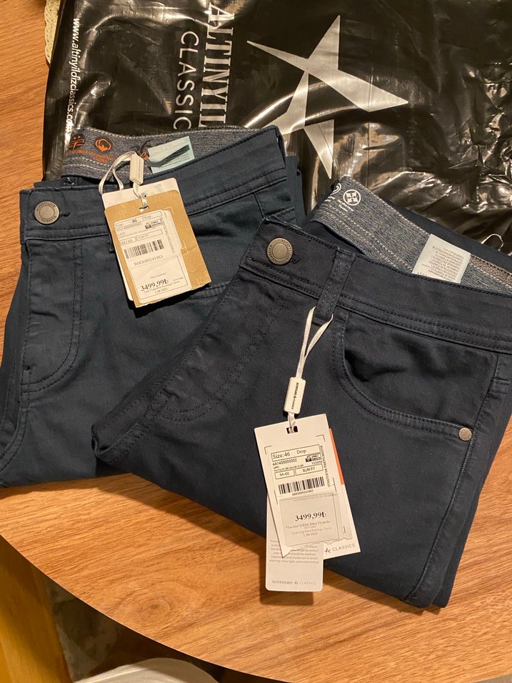 Düğmeli ve baskılı detaylara sahip lacivert denim erkek pantolon, normal kesim ve günlük kullanım için uygundur. Trendy casual tarzda. Paça ölçüsü bile alınmamış sıfır etiketli ürün
