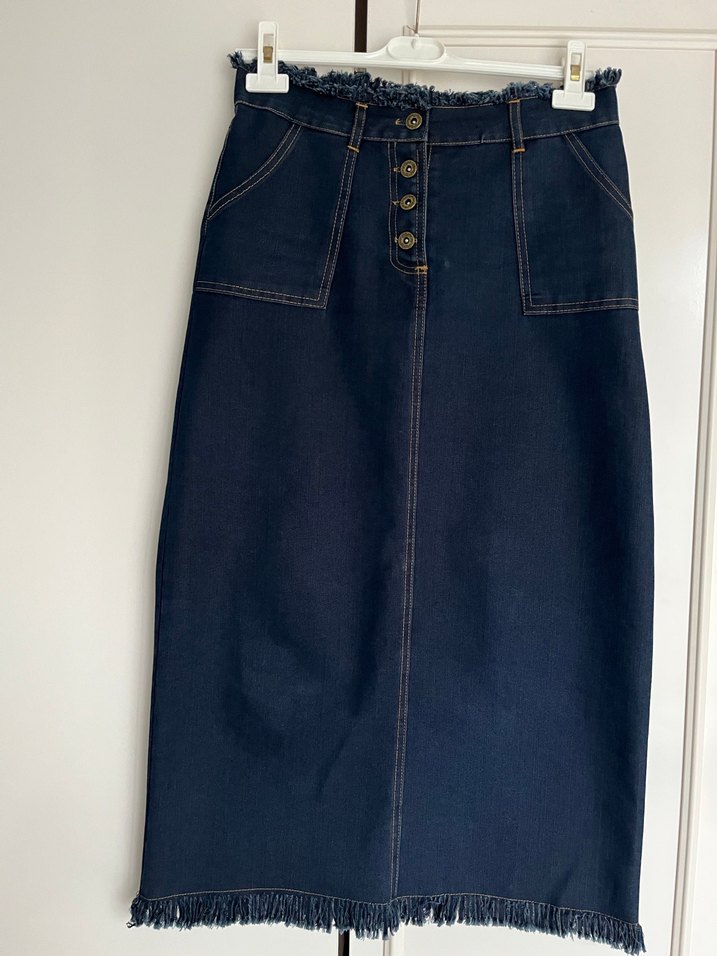 Lacivert, düğmeli ve cep detaylı denim etek. Esnek değildir. Likrasızdır. Sorunsuzdur. İade yoktur.