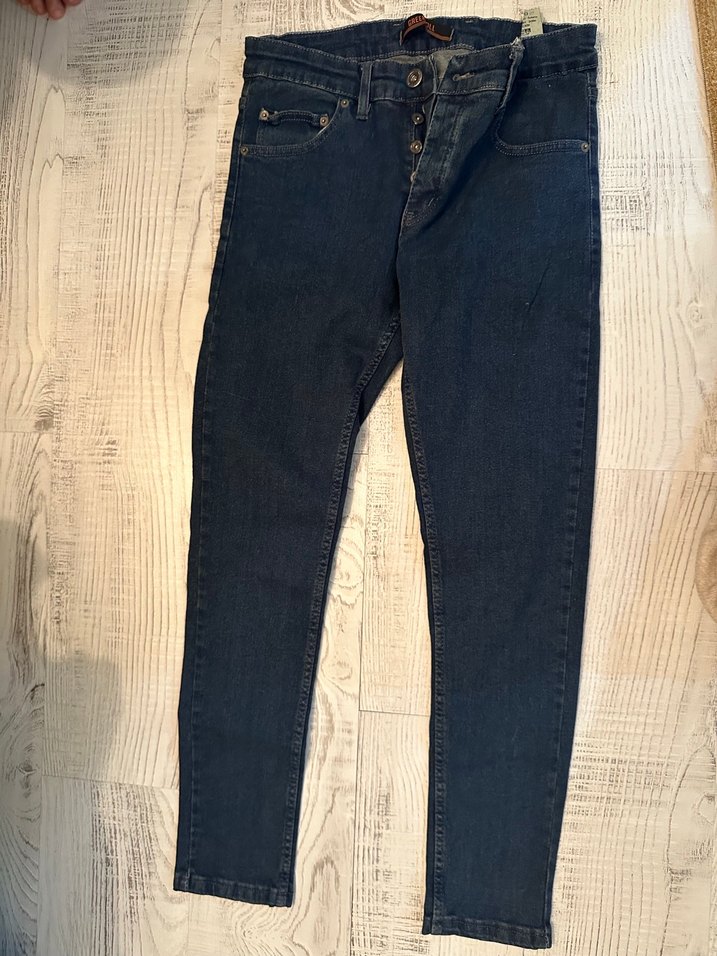 Düğmeli, lacivert renkte denim jean. Normal boy, regular fit ve desen içermeyen sade tasarım. Günlük ve sokak stiline uygun.