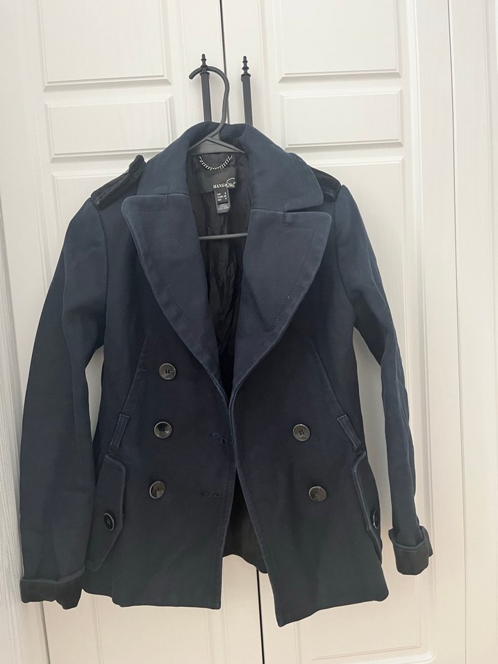 Düğmeli, yakalı ve fitted kesimli lacivert denim kadın midi kaban. Uzun kollu ve ofis ile günlük kullanıma uygun, desen içermeyen şık bir parça.