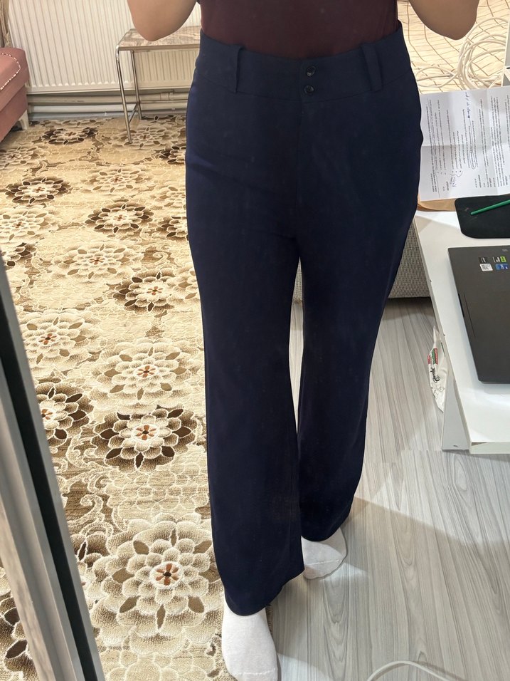 Lacivert denim kumaştan, düğmeli ve normal kalıp midi boy kadın pantolon, ofis için uygun rahat bir tarz sunar. fiziğimi güzel göstermediğini düşündüğüm için satıyorum. 2 kere giydim. markasını hatırlamıyorum. l-xl uyumlu esnek kumaştır.