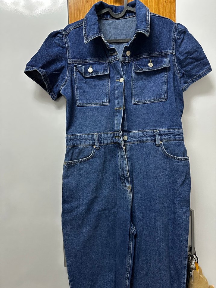 Düğmeli, kısa kollu ve yakalı lacivert denim tulum. Normal boy ve regular fit kesimiyle günlük rahat kullanıma uygun, desen içermeyen şık bir parça.