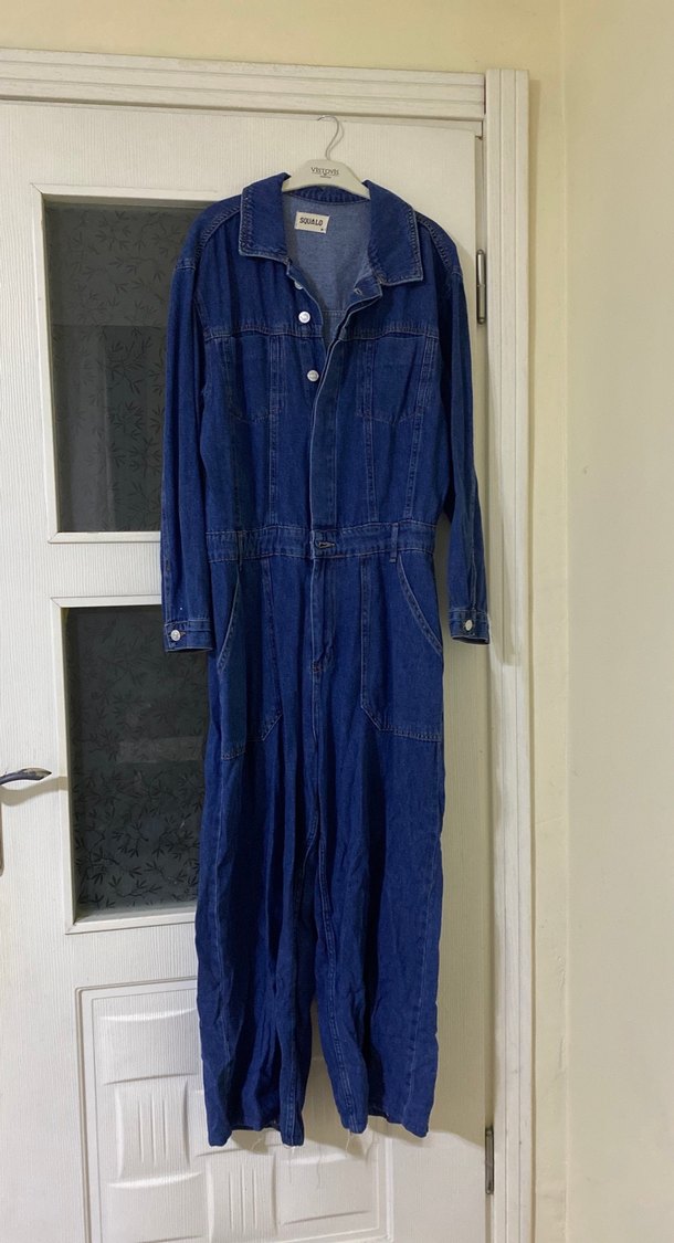 Lacivert denim kumaştan, uzun kollu ve düğmeli önüyle rahat kesim uzun tulum. Günlük kullanıma uygun casual tarzda.