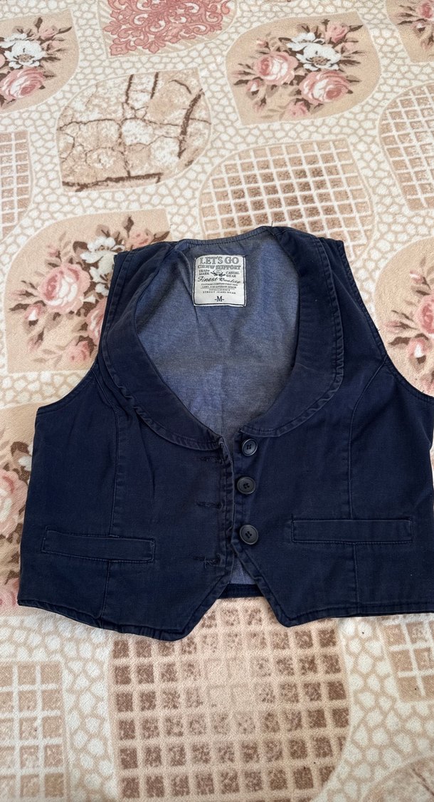 Düğmeli, kesimli yakalı ve lacivert renkte, kadınlar için fitted denim yelek. Kaliteli yurt dışından hediye geldi