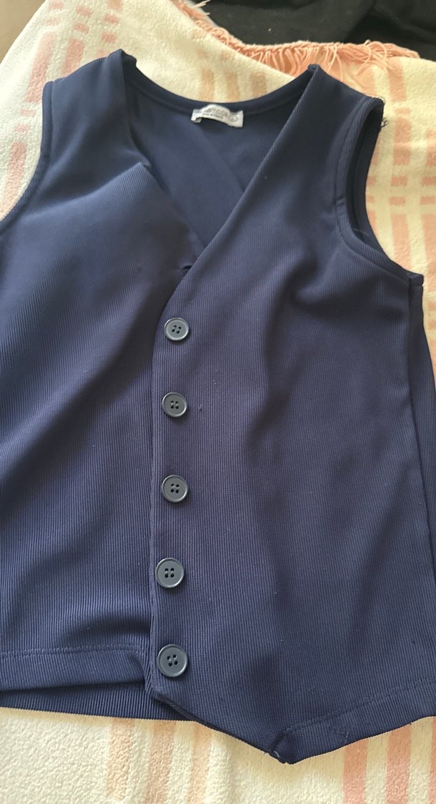 Düğmeli, kolsuz ve oturan kesime sahip lacivert denim yelek. Notlu yaka ve parlak mavi renkte, midi boyda, ofis için uygun.