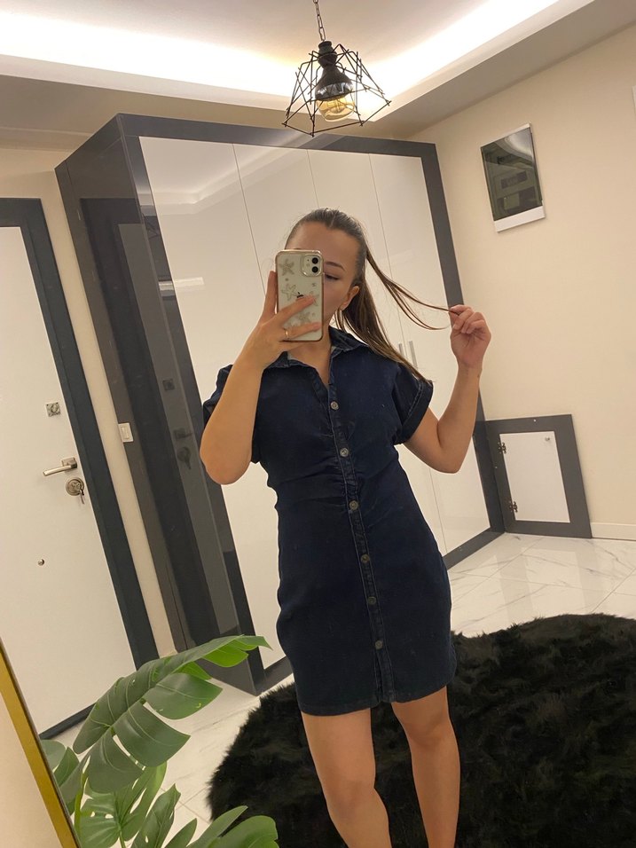 Düğmeli, yakalı ve kısa kollu denim midi elbise. Günlük rahat tarz için uygun, vücuda oturan kesim. Düğmeleri açılmıyor