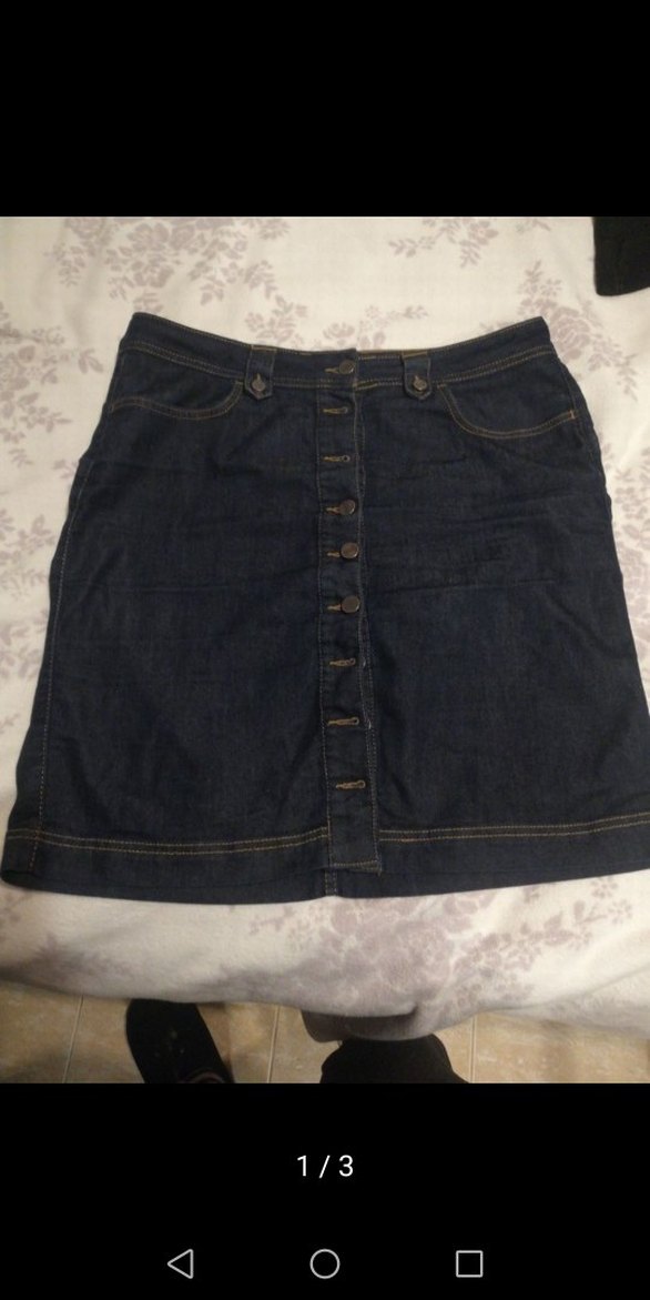 Düğmeli ve vücuda oturan lacivert denim midi etek, günlük sokak stiline uygundur.