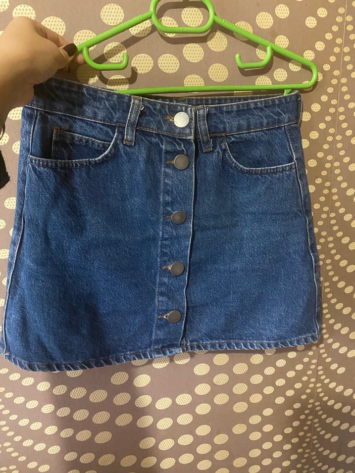 Düğmeli ön kısmı ve bol kesimi ile lacivert denim mini etek, günlük kullanıma uygun rahat sokak stili sunar. Normal boyda ve desensizdir.