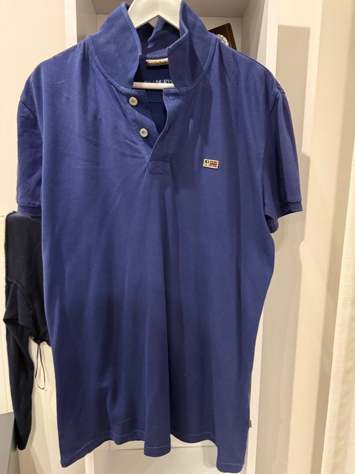 Düğmeli plaka detayı olan lacivert denim polo tişört, kısa kollu ve yakalıdır. Günlük sokak tarzı için uygundur.