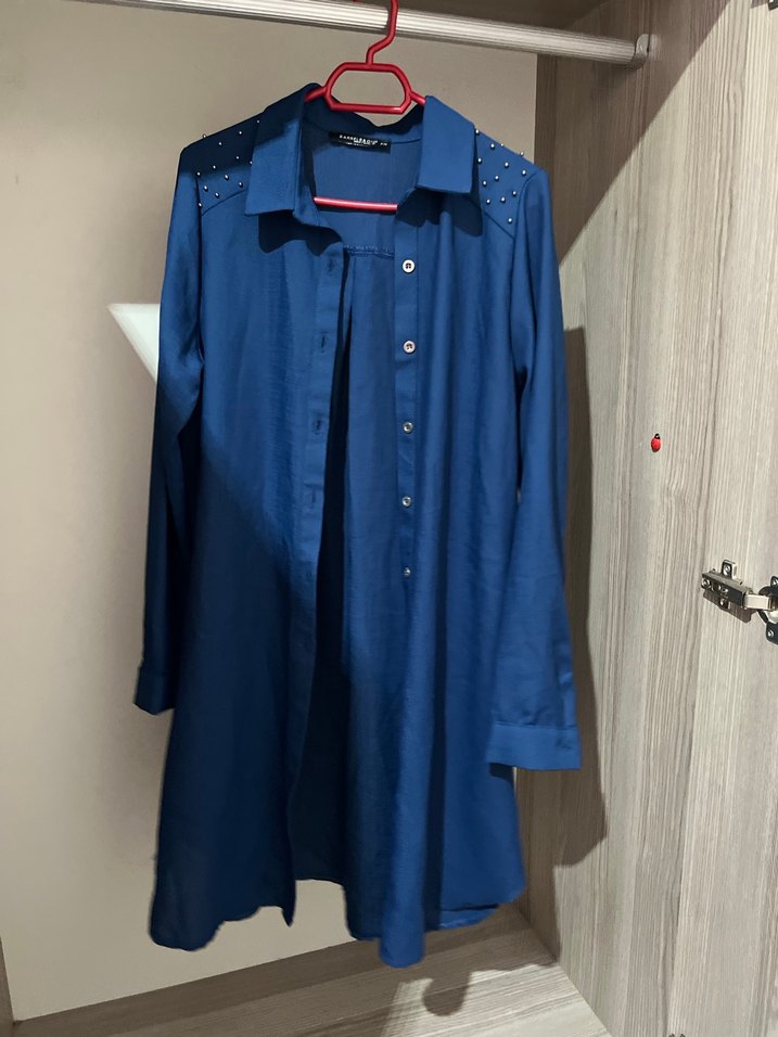 Lacivert denim kumaştan, düğmeli ve cepli, uzun kollu, notched lapel yakalı, omuzları küçük taşlarla süslenmiş, bol kesim midi tunik.