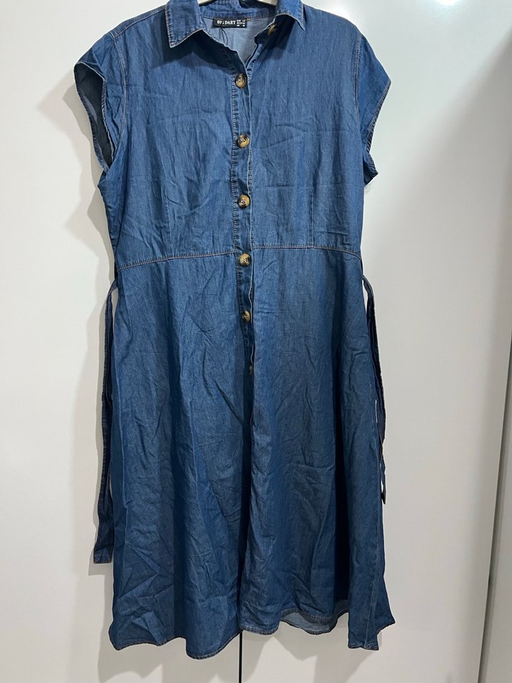 Düğmeli, yakalı ve kolsuz lacivert denim uzun elbise. Bol kesimli ve parlak dokusuyla günlük kullanıma uygundur.