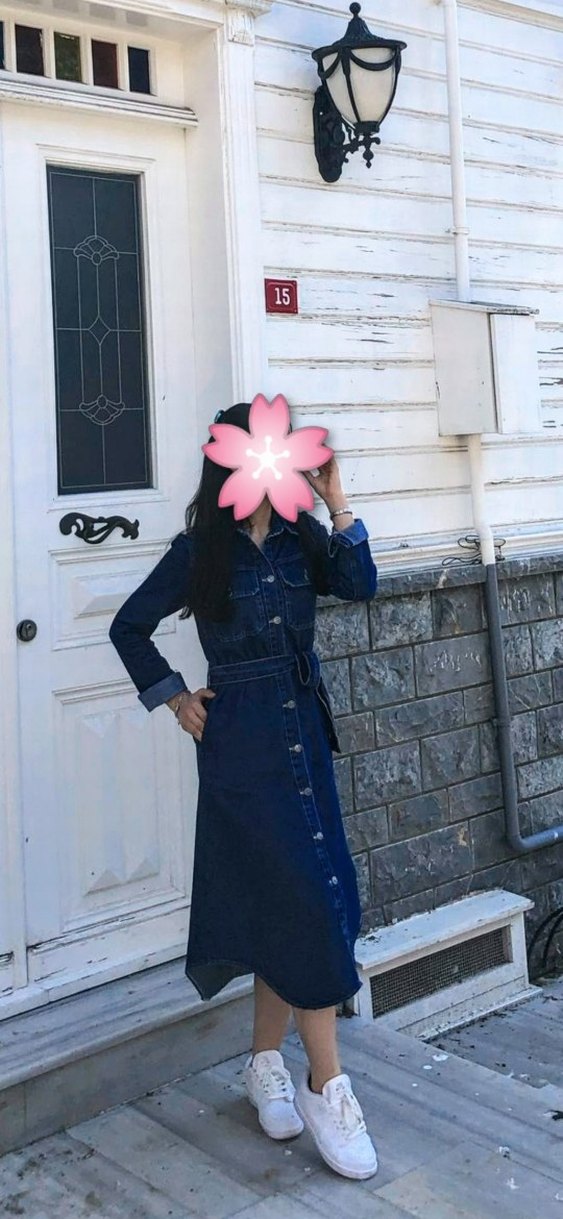 Düğmeli, yakalı ve uzun kollu lacivert kot elbise, fit kesimi ve batik desen detaylarıyla günlük kullanıma uygun.bir kere tek giyildi.