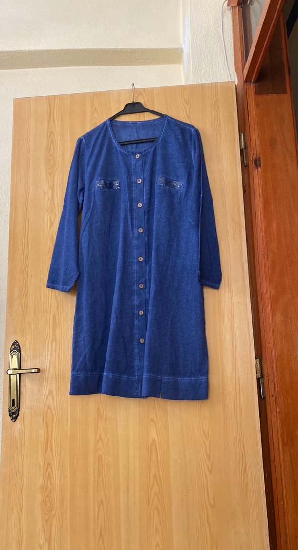 Lacivert denim tunik, düğmeli ön, uzun kollu, bol kesim ve midi boydadır. Notlu yaka ve parlak dokusu ile günlük rahat kullanım için uygundur.
