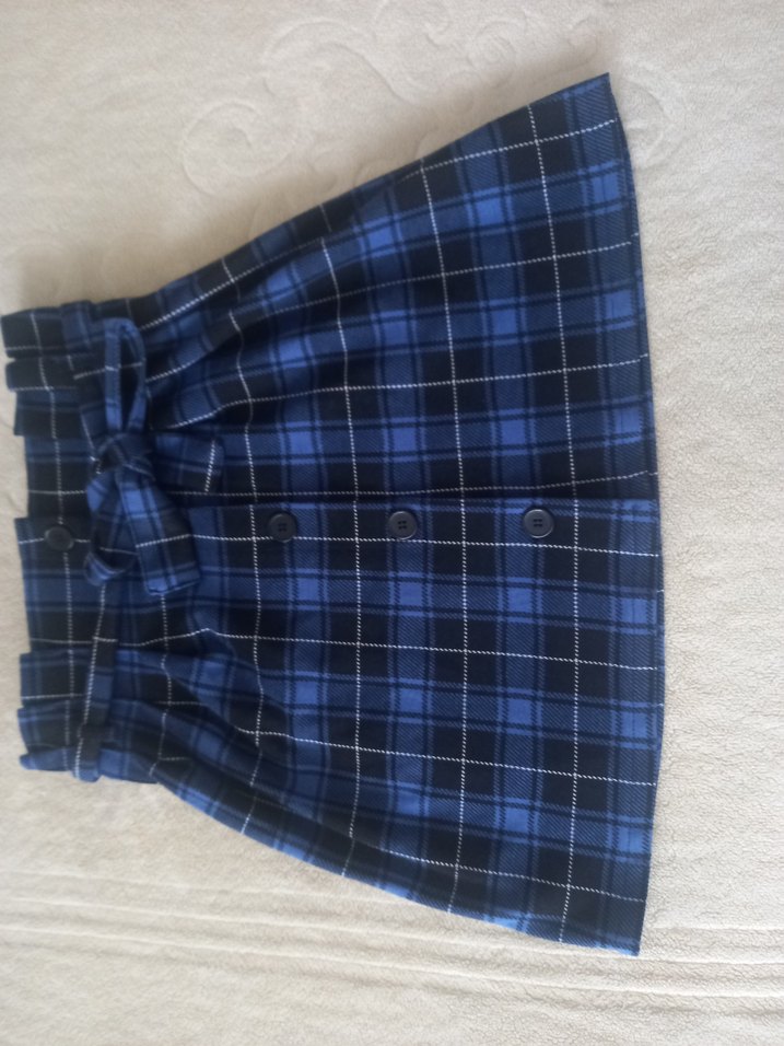 Düğmeli, lacivert ekose desenli midi etek, sentetik kumaştan ve rahat kesimlidir. Günlük sokak stiline uygundur. bel 40 cm boy 50 cm.sadece 1 kete giyildi