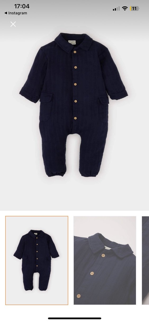 Düğmeli, notched lapel yakalı lacivert erkek bebek tulumu. Yumuşak, sıcak kumaştan, uzun kollu ve sade tasarımlı.