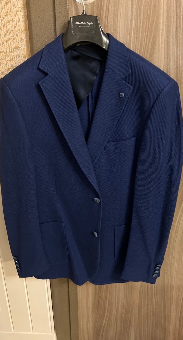 Düğmeli, normal boy, uzun kollu lacivert erkek ceket. Klasik şıklık için uygun, iş ortamına ideal, sade ve desen içermeyen kumaştan.