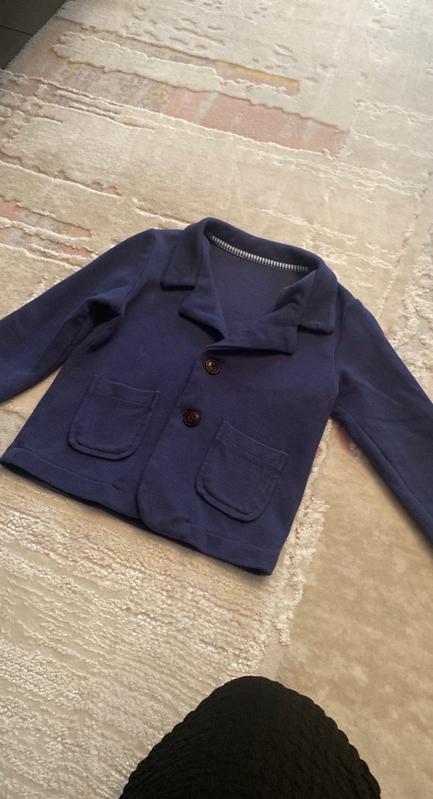 Lacivert erkek çocuk ceketi, düğmeli, çıtmalı yakalı ve iki ön cepli. Yumuşak ve sıcak kumaştan, normal kesim. Sadece 1 defa giyildi yenidir düğün için almıştım