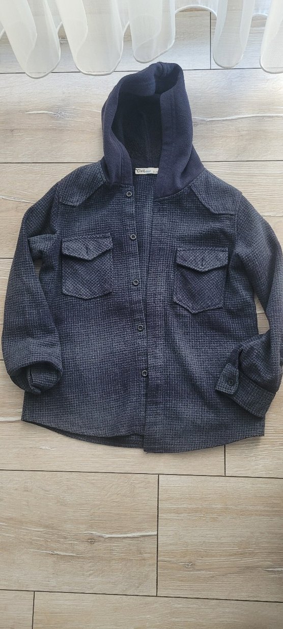 Düğmeli, lacivert kumaştan yapılmış erkek çocuk gömlek, bol kesim ve notched yaka ile. Sokak stili, kapüşonlu ve cepli tasarım.