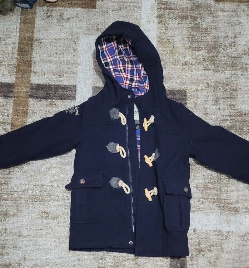 Düğmeli ön kısmı ve çentikli yaka tipi olan, yumuşak kumaştan yapılmış lacivert çocuk mont. Sokak giyim tarzında, kullanışlı ceplidir. Unisex çocuk kaşe mont. Az kullanıldı.