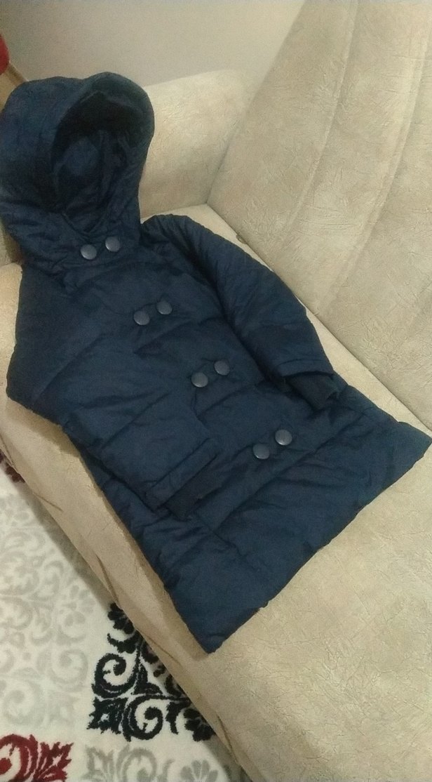 Düğmeli, uzun kollu ve kesimli lacivert erkek çocuk kışlık mont. Yumuşak ve sıcak kumaştan, günlük kullanıma uygun uzun boyda. ❄️ sayılı giyildi