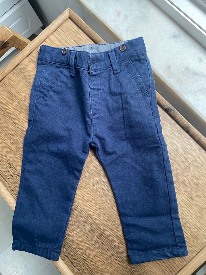 Düğmeli, düz lacivert kot pantolon. Erkek çocuklar için rahat, normal kesim ve temel tarzda.