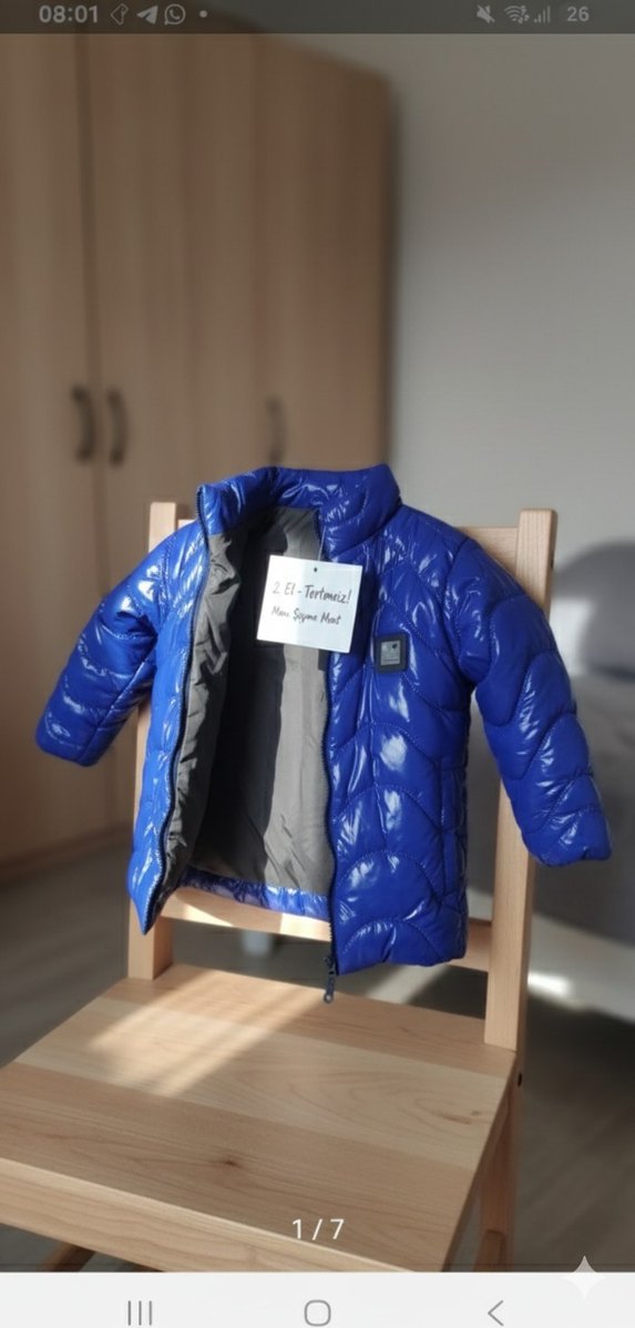 Düğmeli ve kesimli, lacivert baskılı plastik erkek çocuk montu. Notched lapel yakalı, sokak tarzına uygun bir model. sadece etiketi yok ürün 2 kere belki giyildi