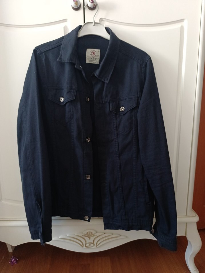 Düğmeli, notalı yakalı, uzun kollu lacivert erkek denim ceket, rahat kesimi ve günlük kullanıma uygun tarzıyla öne çıkar.