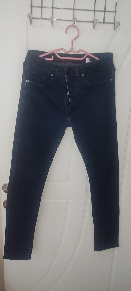 Düğmeli ve normal boyda, koyu lacivert renkte denim kumaştan üretilmiş erkek jean. Günlük sokak stiline uygun, desensiz tasarıma sahip. Boy:106 cm-Bel:37 cm-Paça:15 cm İki tane düğmesi çıkmış durumda,yerine takılıp kullanılabilir.Almadan önce iletişime geçiniz.Kilo aldığımdan dolayı satıyorum.İkinci eldir.İade yoktur. Herşey tüm şaffaflığı ile yazıyor.