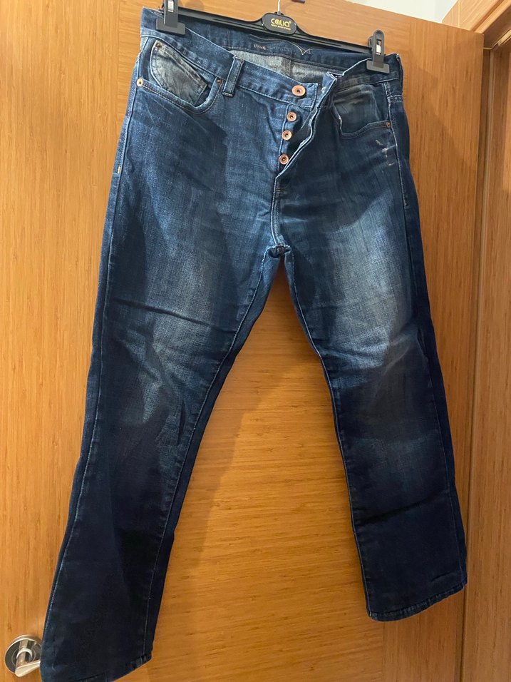 Düğmeli ön kısma sahip lacivert erkek denim pantolon. Orta boy ve parlak yüzeyli, rahat kesim günlük spor tarzda jean pantolon.