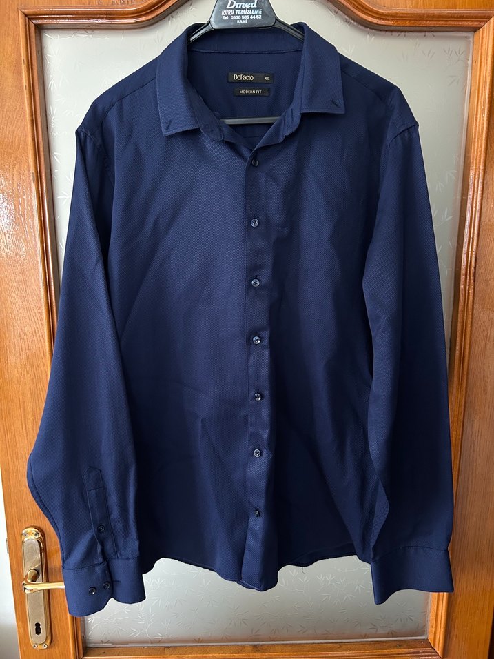 Düğmeli, uzun kollu, lacivert erkek gömleği. Normal kesim ve yakalı, sentetik kumaştan, ofis için uygun.