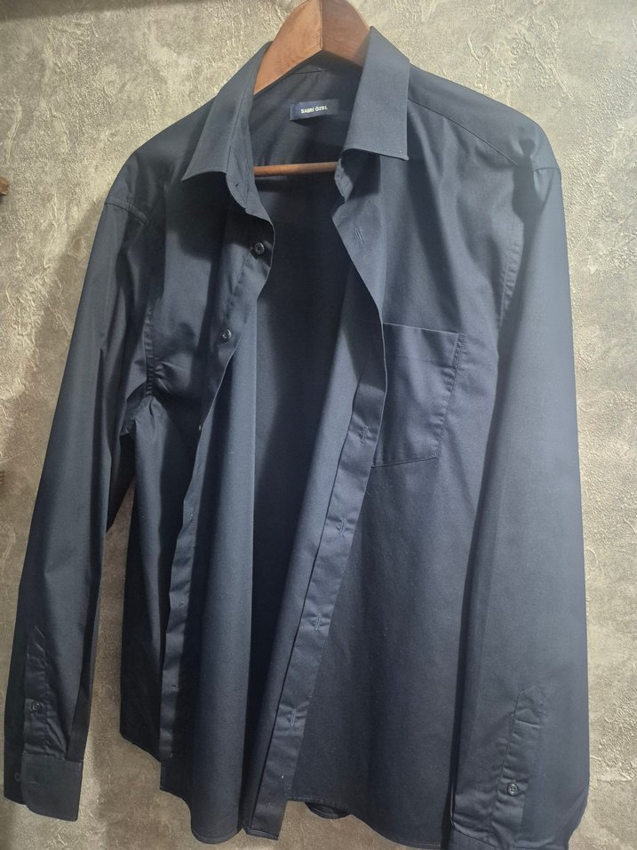 Düğmeli, lacivert erkek gömlek, çentikli yaka ve uzun kolludur. Keten kumaştan üretilmiş, ofis ve sokak stiline uygundur. Düzenli kesim ve sade tasarıma sahiptir. gıyilmedi sıfırdır boy 80 cm omuz genıslıgı 50 cm koltuk altı genişliği 60 cm