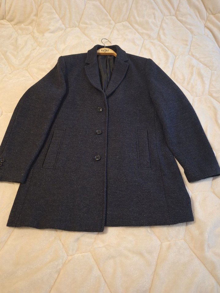 Düğmeli ön kısmı, klasik erkek yün kaban, lacivert renkte, uzun kollu ve normal boydadır. Ofis kullanımı için uygundur. İki koltuk altı arası 55cm, kol boyu 65 cm ve boy 85 cm. Çok az sayıda giyilmiştir. Hiç bir defosu yoktur.