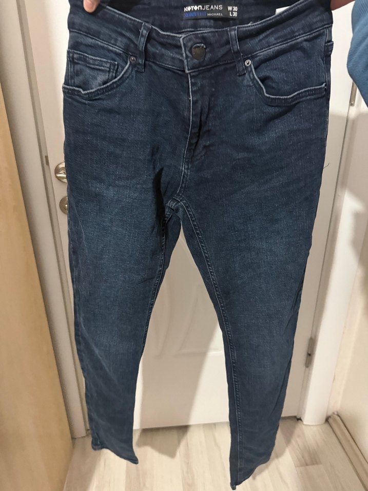 Düğmeli, lacivert renkli, dar kesim erkek kot pantolon. Günlük kullanıma uygun, desen içermeyen sade tasarıma sahiptir.Hiçbir hasarı yoktur