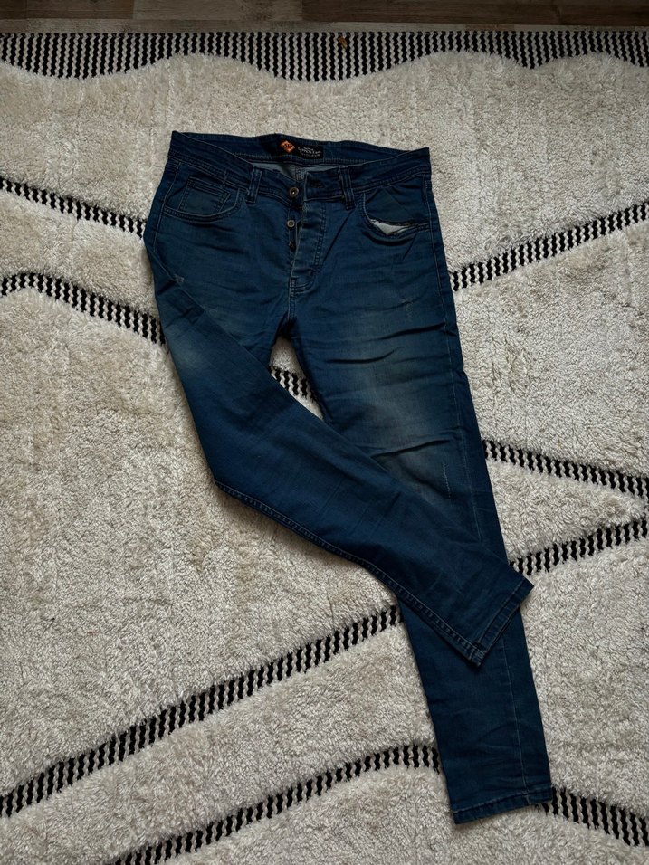 Düğmeli, regular fit, lacivert renkte, günlük rahat sokak stili için uygun midi uzunlukta erkek kot pantolon.