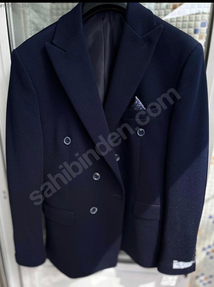 Lacivert renkli, düğmeli ve kırlangıç yaka erkek ceket, modern klasik tarzda ve ofis kullanımına uygun normal kalıp modeldir.