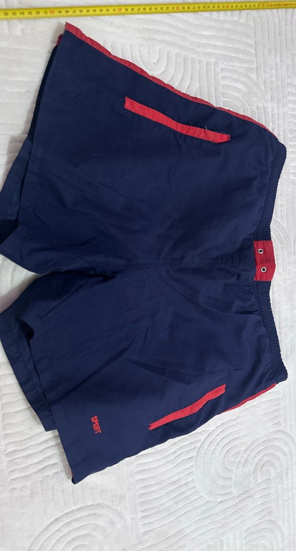 Sentetik kumaştan yapılmış, kırmızı detaylı düğmeli lacivert erkek mini şort. Plaj ve sokak giyimine uygun, dar kesim.