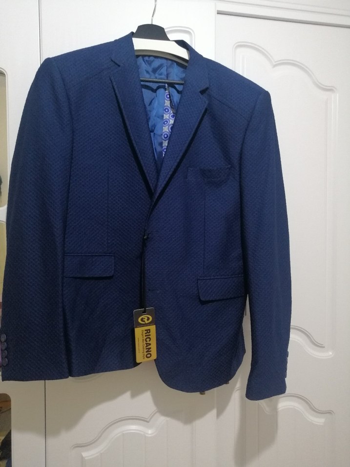 Düğmeli, kesik yakalı, uzun kollu, normal boy lacivert erkek ofis takım elbise ceketi.