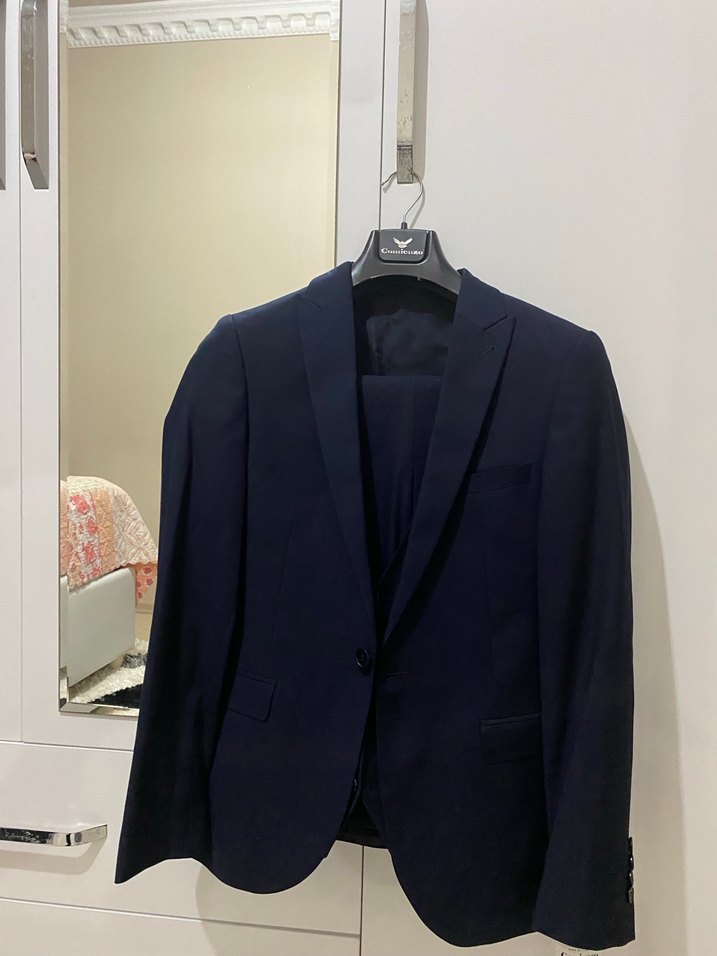 Lacivert, düğmeli, klasik kesim erkek takım elbise 44 beden pantolon yelek ceket fiyatı