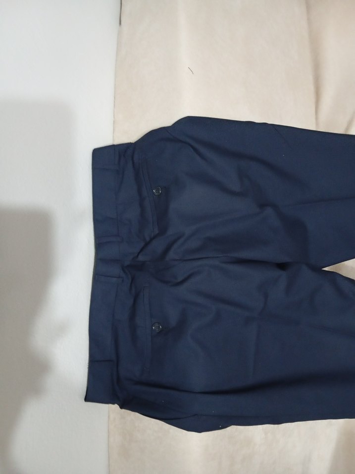 Düğmeli kapamalı, düz lacivert erkek pantolon. Rahat kalıp ve sentetik kumaştan üretilmiştir. Minimalist ve ofis tarzına uygundur. ✨ bel 47 cm. beden 115 cm. nedenini kendine göre yaptırın. henüz işlenmemiş.
