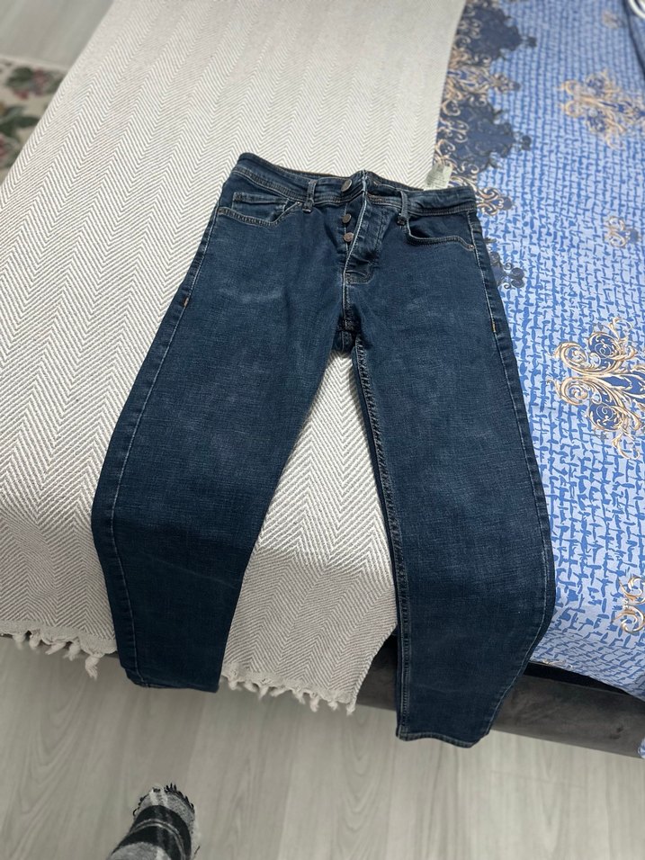 Düğmeli, bol kesim lacivert denim midi uzunlukta erkek jean, günlük kullanım için rahat ve sokak modasına uygun.