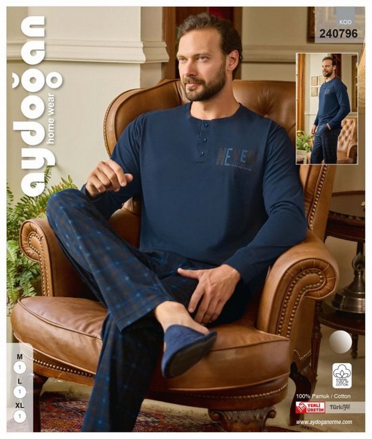 AYDOĞAN 240796 ERKEK SÜPREM PATLI U.KOL PJ TKM stokta sadece mideum beden vardır Lacivert tonlarında, bağlama desenli erkek pijama takımıdır. Normal kesim, uzun kollu, yuvarlak yakalı ve düğmeli üst kısmı vardır. Rahat ve midi boy pantolonla tamamlanmıştır.