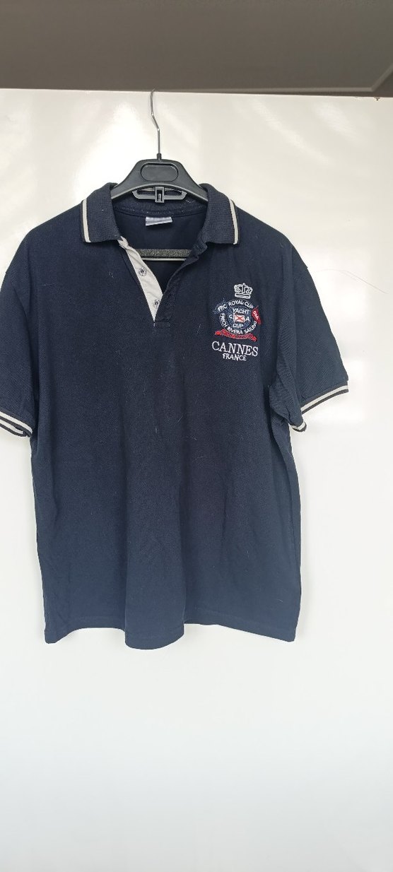 Bu erkek polo tişörtü, düğmeli ve kısa kolludur. Pamuklu, rahat kesimli ve baskılıdır. Mavi renkli, gri detaylı ve "CANNES" yazılıdır.