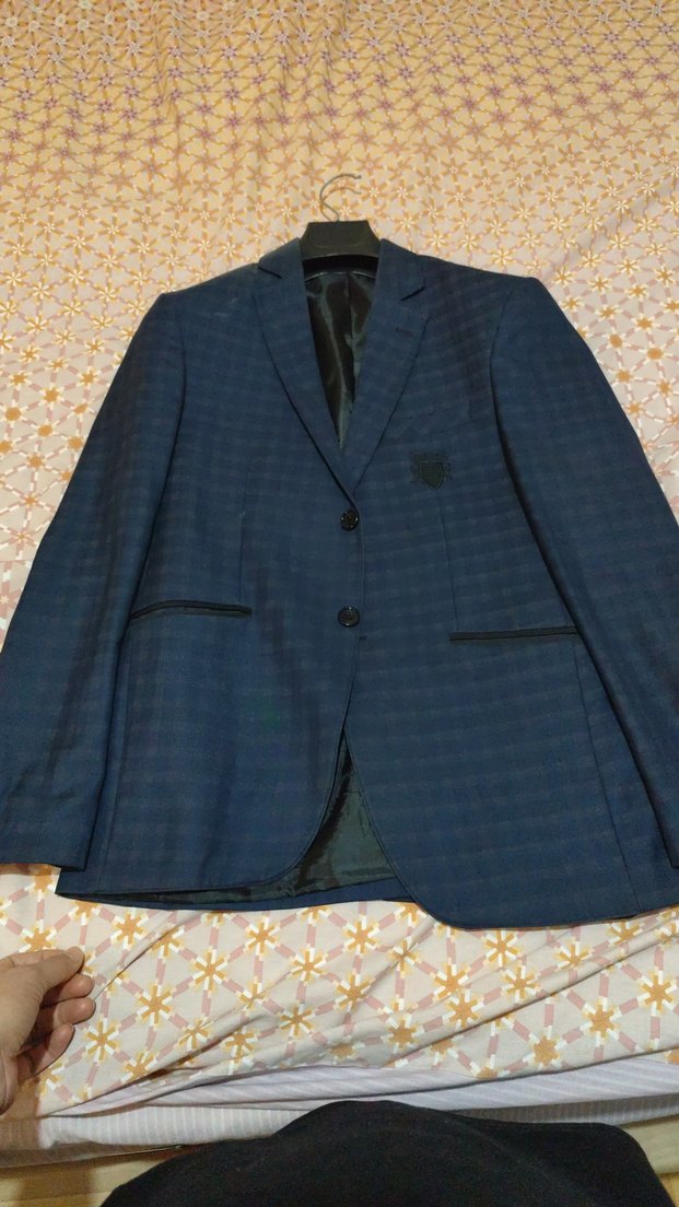 Düğmeli, uzun kollu, normal boy lacivert erkek takım ceketi. İş ve günlük stil için uygun, klasik kesim ve yaka detaylı.