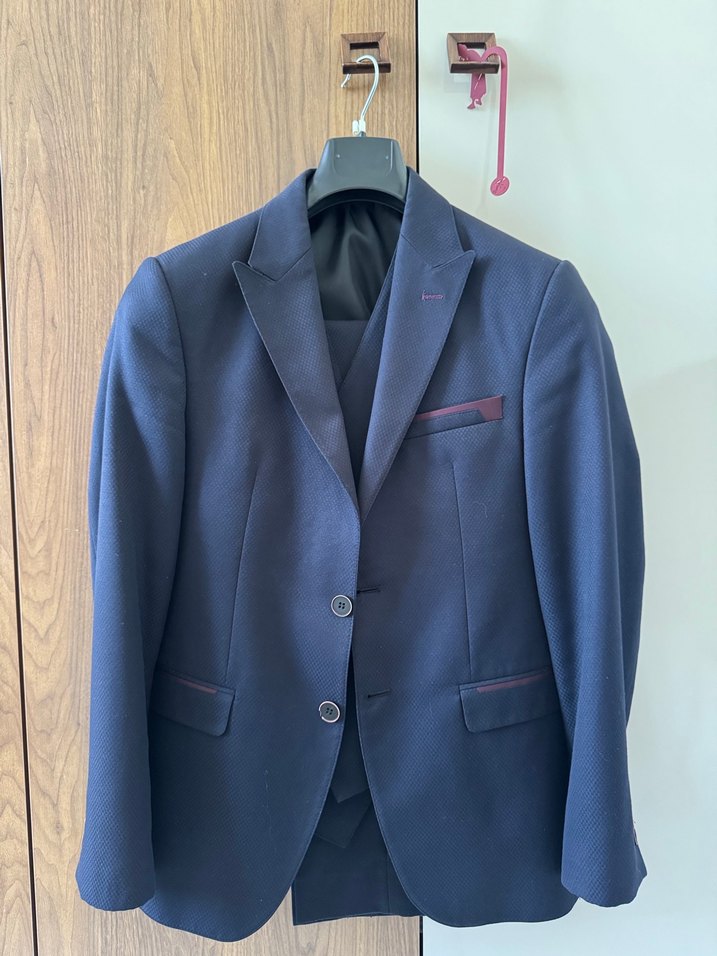 Düğmeli, normal boy, klasik lacivert erkek takım ve elbisesi. Notch yaka ve uzun kolludur, iş ortamları için uygundur. Tek renk ve düzenli kesimlidir. 48 beden