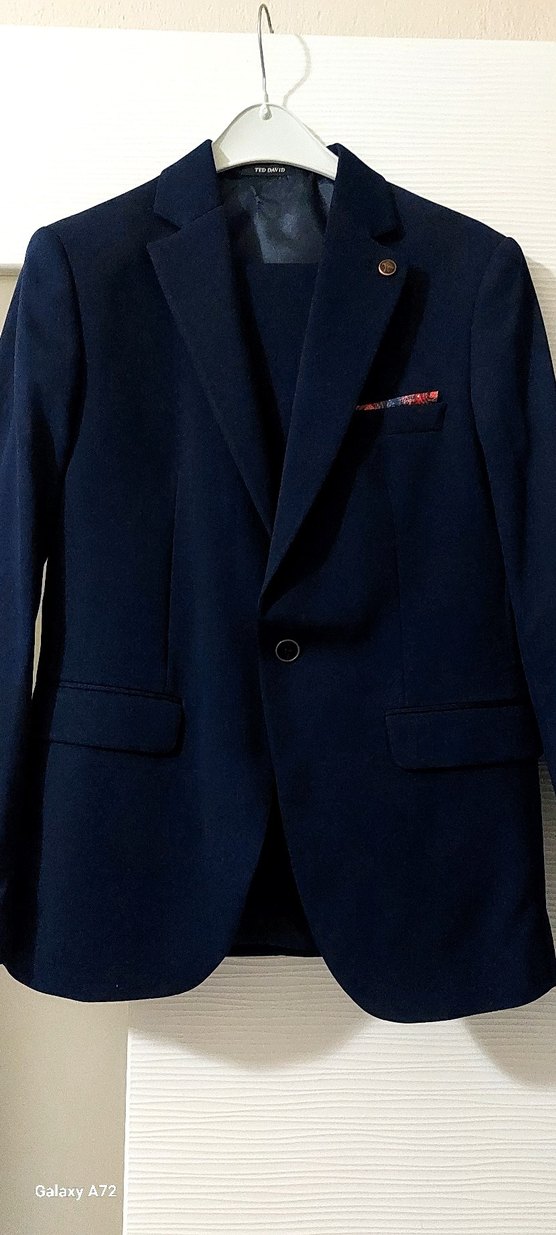 Düğmeli, lacivert erkek takım elbise ceketi, klasik yaka ve uzun kolludur. Ofis ve iş ortamları için uygun, modern klasik tarzda şık bir parçadır. ️