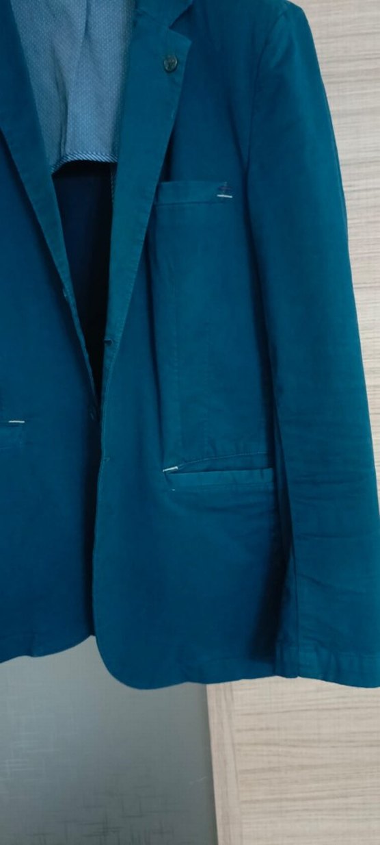 Düğmeli, normal boy midi uzunluğunda, lacivert renk ve düz desensiz erkek takım elbise ceketi. Notch yaka ve uzun kollu, ofis ve sokak stiline uygun şık parça.